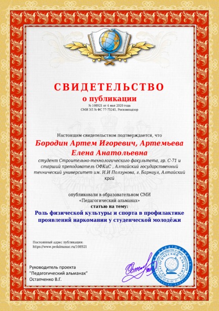 Бородин Артем Игоревич, Артемьева Елена Анатольевна Роль физической культуры и спорта в профилактике проявлений наркомании у студенческой молодёжи / А. И. Бородин. – Текст : электронный // Педагогический альманах : электронное СМИ. - URL: https://www.pedalmanac.ru/108921. - Дата публикации: 4 мая 2020.