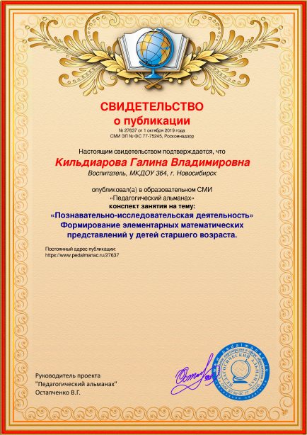 «Познавательно-исследовательская деятельность» Формирование элементарных математических представлений у детей старшего возраста.