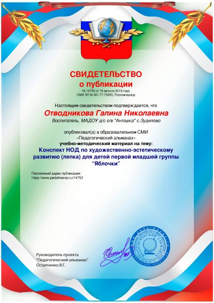 Конспект НОД по художественно-эстетическому развитию (лепка) для детей первой младшей группы “Яблочки”