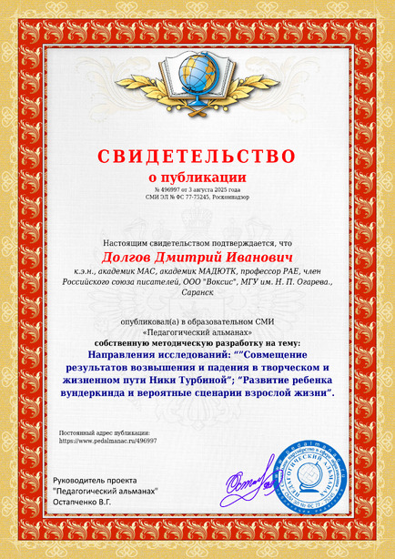 Направления исследований: “”Совмещение результатов возвышения и падения в творческом и жизненном пути Ники Турбиной”; “Развитие ребенка вундеркинда и вероятные сценарии взрослой жизни”.