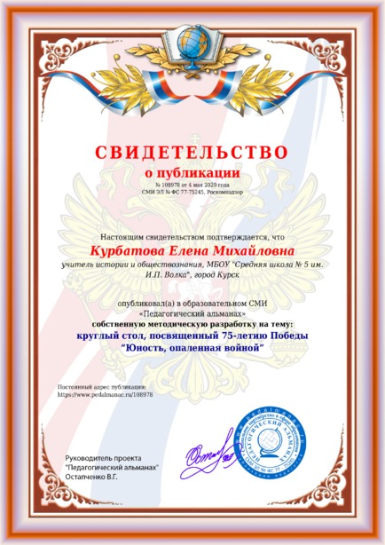 Курбатова Елена Михайловна круглый стол, посвященный 75-летию Победы “Юность, опаленная войной” / Е. М. Курбатова. – Текст : электронный // Педагогический альманах : электронное СМИ. - URL: https://www.pedalmanac.ru/108978. - Дата публикации: 4 мая 2020.