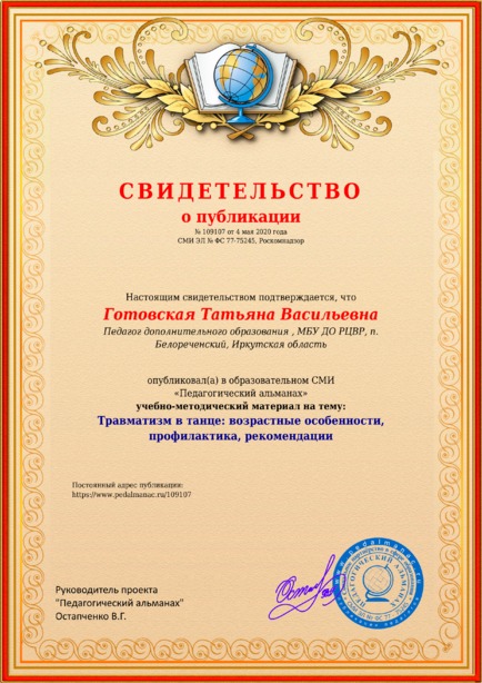 Готовская Татьяна Васильевна Травматизм в танце: возрастные особенности, профилактика, рекомендации / Т. В. Готовская. – Текст : электронный // Педагогический альманах : электронное СМИ. - URL: https://www.pedalmanac.ru/109107. - Дата публикации: 4 мая 2020.