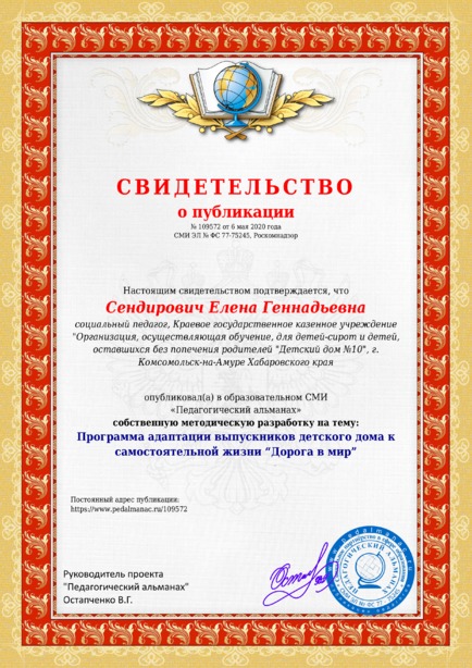 Сендирович Елена Геннадьевна Программа адаптации выпускников детского дома к самостоятельной жизни “Дорога в мир” / Е. Г. Сендирович. – Текст : электронный // Педагогический альманах : электронное СМИ. - URL: https://www.pedalmanac.ru/109572. - Дата публикации: 6 мая 2020.
