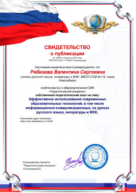 После оплаты Вам моментально предоставляется именное «Свидетельство о публикации» и «Справка о публикации материала в СМИ»В соответствии с пп. 36, 37 Приказа Минобрнауки РФ №276 «Об утверждении Порядка проведения аттестации педагогических работников» является подтверждением транслирования в педагогических коллективах опыта практических результатов своей профессиональной деятельности, в том числе экспериментальной и инновационной. установленного образца в печатном качестве, которые Вы можете приложить к портфолио и предъявить при прохождении аттестации.