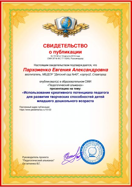 После оплаты Вам моментально предоставляется именное «Свидетельство о публикации» и «Справка о публикации материала в СМИ»В соответствии с пп. 36, 37 Приказа Минобрнауки РФ №276 «Об утверждении Порядка проведения аттестации педагогических работников» является подтверждением транслирования в педагогических коллективах опыта практических результатов своей профессиональной деятельности, в том числе экспериментальной и инновационной. установленного образца в печатном качестве, которые Вы можете приложить к портфолио и предъявить при прохождении аттестации.