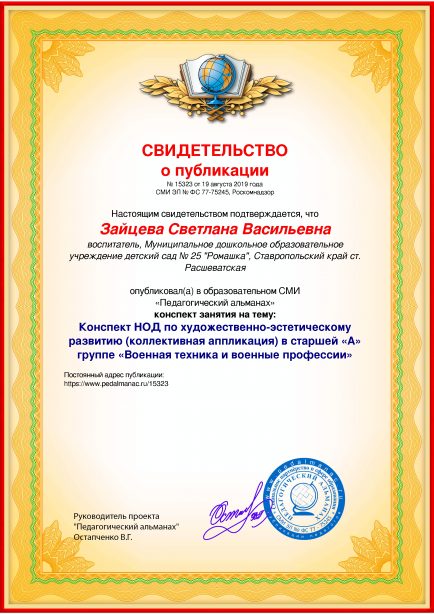 После оплаты Вам моментально предоставляется именное «Свидетельство о публикации» и «Справка о публикации материала в СМИ»В соответствии с пп. 36, 37 Приказа Минобрнауки РФ №276 «Об утверждении Порядка проведения аттестации педагогических работников» является подтверждением транслирования в педагогических коллективах опыта практических результатов своей профессиональной деятельности, в том числе экспериментальной и инновационной. установленного образца в печатном качестве, которые Вы можете приложить к портфолио и предъявить при прохождении аттестации.