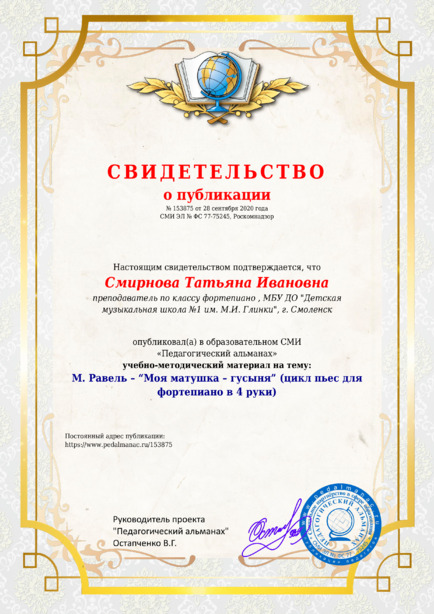 Смирнова Татьяна Ивановна М. Равель – “Моя матушка – гусыня” (цикл пьес для фортепиано в 4 руки) / Т. И. Смирнова. – Текст : электронный // Педагогический альманах : электронное СМИ. - URL: https://www.pedalmanac.ru/153875. - Дата публикации: 28 сентября 2020.