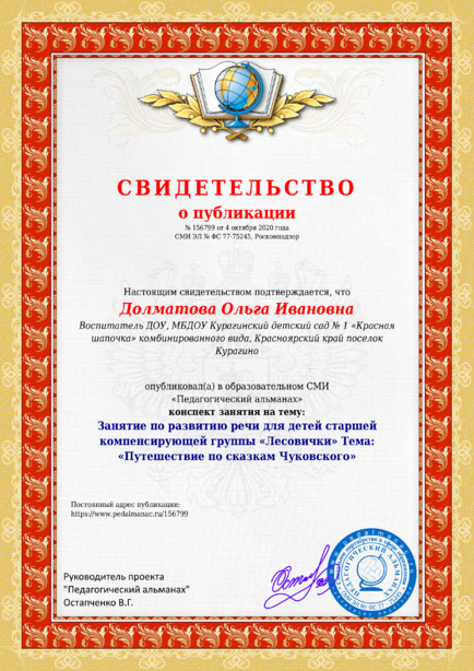 Долматова Ольга Ивановна Занятие по развитию речи для детей старшей компенсирующей группы «Лесовички» Тема: «Путешествие по сказкам Чуковского» / О. И. Долматова. – Текст : электронный // Педагогический альманах : электронное СМИ. - URL: https://www.pedalmanac.ru/156799. - Дата публикации: 4 октября 2020.