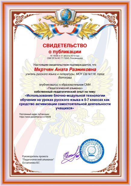 После оплаты Вам моментально предоставляется именное «Свидетельство о публикации» и «Справка о публикации материала в СМИ»В соответствии с пп. 36, 37 Приказа Минобрнауки РФ №276 «Об утверждении Порядка проведения аттестации педагогических работников» является подтверждением транслирования в педагогических коллективах опыта практических результатов своей профессиональной деятельности, в том числе экспериментальной и инновационной. установленного образца в печатном качестве, которые Вы можете приложить к портфолио и предъявить при прохождении аттестации.