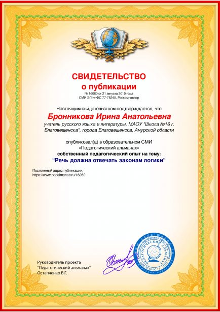 После оплаты Вам моментально предоставляется именное «Свидетельство о публикации» и «Справка о публикации материала в СМИ»В соответствии с пп. 36, 37 Приказа Минобрнауки РФ №276 «Об утверждении Порядка проведения аттестации педагогических работников» является подтверждением транслирования в педагогических коллективах опыта практических результатов своей профессиональной деятельности, в том числе экспериментальной и инновационной. установленного образца в печатном качестве, которые Вы можете приложить к портфолио и предъявить при прохождении аттестации.