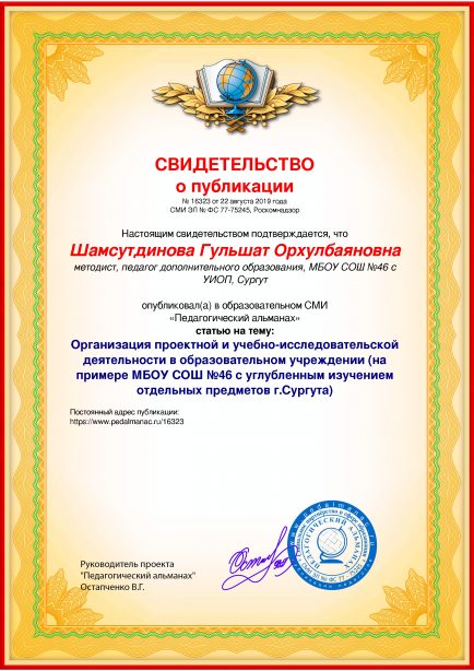 После оплаты Вам моментально предоставляется именное «Свидетельство о публикации» и «Справка о публикации материала в СМИ»В соответствии с пп. 36, 37 Приказа Минобрнауки РФ №276 «Об утверждении Порядка проведения аттестации педагогических работников» является подтверждением транслирования в педагогических коллективах опыта практических результатов своей профессиональной деятельности, в том числе экспериментальной и инновационной. установленного образца в печатном качестве, которые Вы можете приложить к портфолио и предъявить при прохождении аттестации.