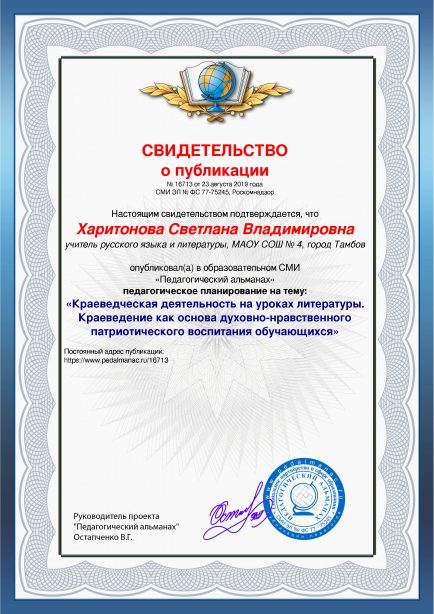 Харитонова Светлана Владимировна «Краеведческая деятельность на уроках литературы. Краеведение как основа духовно-нравственного патриотического воспитания обучающихся» / С. В. Харитонова. – Текст : электронный // Педагогический альманах : электронное СМИ. - URL: https://www.pedalmanac.ru/16713. - Дата публикации: 23 августа 2019.