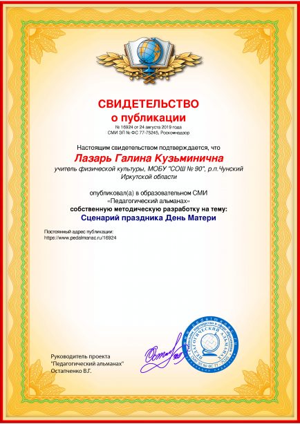 Лазарь Галина Кузьминична Сценарий праздника День Матери / Г. К. Лазарь. – Текст : электронный // Педагогический альманах : электронное СМИ. - URL: https://www.pedalmanac.ru/16924. - Дата публикации: 24 августа 2019.