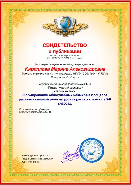 После оплаты Вам моментально предоставляется именное «Свидетельство о публикации» и «Справка о публикации материала в СМИ»В соответствии с пп. 36, 37 Приказа Минобрнауки РФ №276 «Об утверждении Порядка проведения аттестации педагогических работников» является подтверждением транслирования в педагогических коллективах опыта практических результатов своей профессиональной деятельности, в том числе экспериментальной и инновационной. установленного образца в печатном качестве, которые Вы можете приложить к портфолио и предъявить при прохождении аттестации.