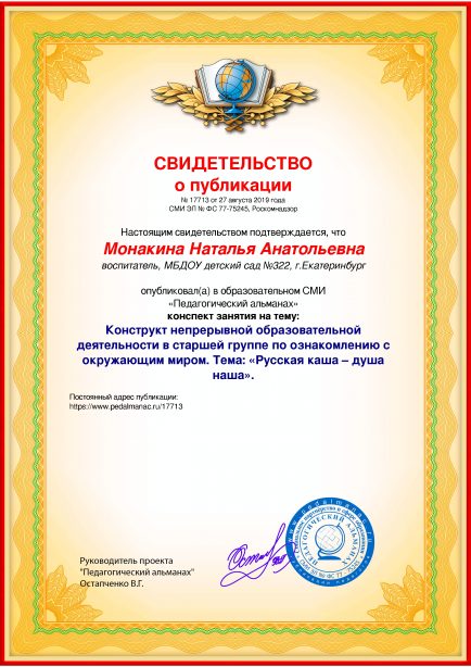 Монакина Наталья Анатольевна Конструкт непрерывной образовательной деятельности в старшей группе по ознакомлению с окружающим миром. Тема: «Русская каша – душа наша». / Н. А. Монакина. – Текст : электронный // Педагогический альманах : электронное СМИ. - URL: https://www.pedalmanac.ru/17713. - Дата публикации: 27 августа 2019.