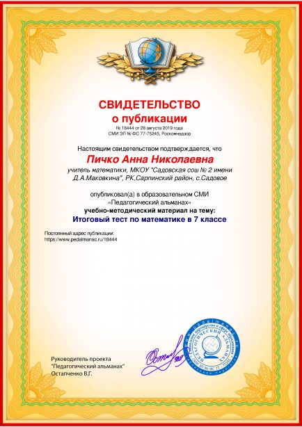 Пичко Анна Николаевна Итоговый тест по математике в 7 классе / А. Н. Пичко. – Текст : электронный // Педагогический альманах : электронное СМИ. - URL: https://www.pedalmanac.ru/18444. - Дата публикации: 28 августа 2019.
