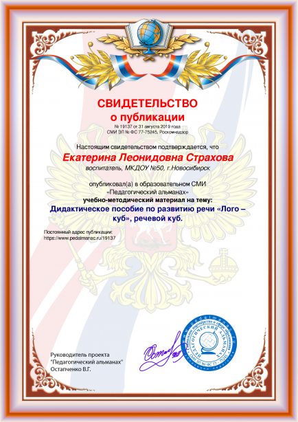 Екатерина Леонидовна Страхова Дидактическое пособие по развитию речи «Лого – куб», речевой куб. / Л. С. Екатерина. – Текст : электронный // Педагогический альманах : электронное СМИ. - URL: https://www.pedalmanac.ru/19137. - Дата публикации: 31 августа 2019.