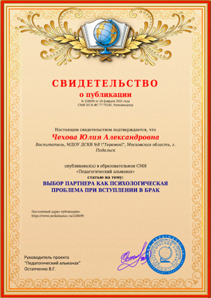 Чехова Юлия Александровна ВЫБОР ПАРТНЕРА КАК ПСИХОЛОГИЧЕСКАЯ ПРОБЛЕМА ПРИ ВСТУПЛЕНИИ В БРАК / Ю. А. Чехова. – Текст : электронный // Педагогический альманах : электронное СМИ. - URL: https://www.pedalmanac.ru/228699. - Дата публикации: 24 февраля 2021.