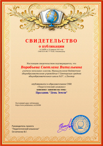Воробьева Светлана Витальевна Праздник “День Земли” / С. В. Воробьева. – Текст : электронный // Педагогический альманах : электронное СМИ. - URL: https://www.pedalmanac.ru/228986. - Дата публикации: 25 февраля 2021.