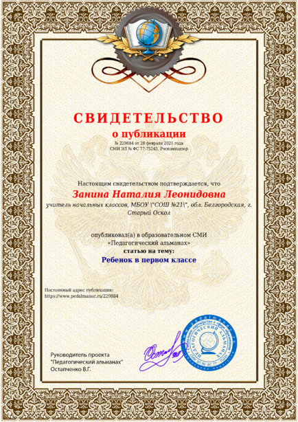 Занина Наталия Леонидовна Ребенок в первом классе / Н. Л. Занина. – Текст : электронный // Педагогический альманах : электронное СМИ. - URL: https://www.pedalmanac.ru/229884. - Дата публикации: 28 февраля 2021.