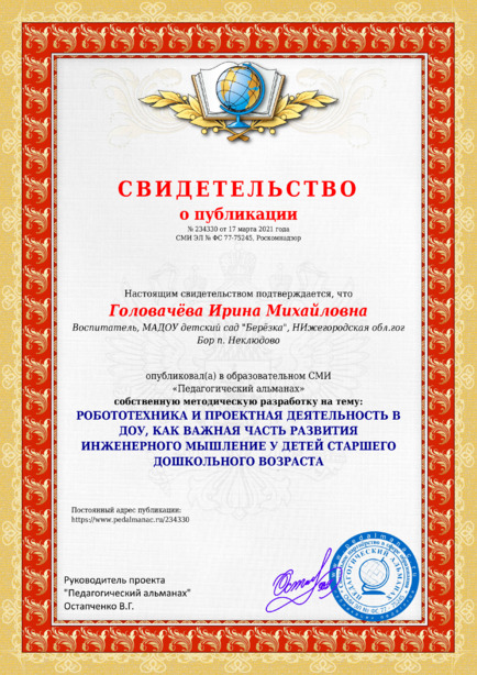 Головачёва, И. М. РОБОТОТЕХНИКА И ПРОЕКТНАЯ ДЕЯТЕЛЬНОСТЬ В ДОУ, КАК ВАЖНАЯ ЧАСТЬ РАЗВИТИЯ ИНЖЕНЕРНОГО МЫШЛЕНИЕ У ДЕТЕЙ СТАРШЕГО ДОШКОЛЬНОГО ВОЗРАСТА [Электронный ресурс] / Ирина Михайловна Головачёва // Педагогический альманах : [сайт]. - 2021. - 17 марта. - [Россия]. - Режим доступа: https://www.pedalmanac.ru/234330, свободный. - Загл. с экрана.