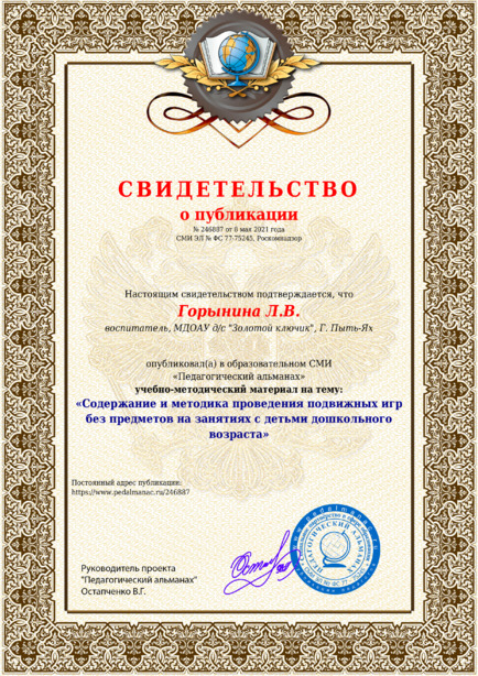Горынина Л.В. «Содержание и методика проведения подвижных игр без предметов на занятиях с детьми дошкольного возраста» / Л. . Горынина. – Текст : электронный // Педагогический альманах : электронное СМИ. - URL: https://www.pedalmanac.ru/246887. - Дата публикации: 8 мая 2021.