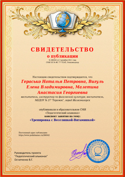 Герасько Наталья Петровна, Вигуль Елена Владимировна, Малетина Анастасия Георгиевна «Тренировка с Веселинкой-Витаминкой» / Н. П. Герасько. – Текст : электронный // Педагогический альманах : электронное СМИ. - URL: https://www.pedalmanac.ru/286042. - Дата публикации: 2 декабря 2021.