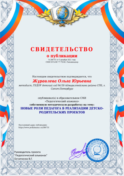 Журавлева Ольга Юрьевна НОВЫЕ РОЛИ ПЕДАГОГА В РЕАЛИЗАЦИИ ДЕТСКО-РОДИТЕЛЬСКИХ ПРОЕКТОВ / О. Ю. Журавлева. – Текст : электронный // Педагогический альманах : электронное СМИ. - URL: https://www.pedalmanac.ru/286751. - Дата публикации: 5 декабря 2021.