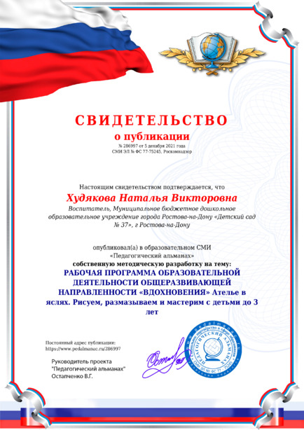 Худякова Наталья Викторовна РАБОЧАЯ ПРОГРАММА ОБРАЗОВАТЕЛЬНОЙ ДЕЯТЕЛЬНОСТИ ОБЩЕРАЗВИВАЮЩЕЙ НАПРАВЛЕННОСТИ «ВДОХНОВЕНИЯ» Ателье в яслях. Рисуем, размазываем и мастерим с детьми до 3 лет / Н. В. Худякова. – Текст : электронный // Педагогический альманах : электронное СМИ. - URL: https://www.pedalmanac.ru/286997. - Дата публикации: 5 декабря 2021.