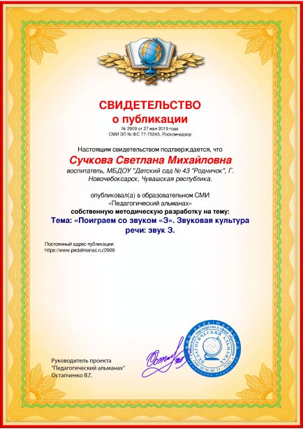 После оплаты Вам моментально предоставляется именное «Свидетельство о публикации» и «Справка о публикации материала в СМИ»В соответствии с пп. 36, 37 Приказа Минобрнауки РФ №276 «Об утверждении Порядка проведения аттестации педагогических работников» является подтверждением транслирования в педагогических коллективах опыта практических результатов своей профессиональной деятельности, в том числе экспериментальной и инновационной. установленного образца в печатном качестве, которые Вы можете приложить к портфолио и предъявить при прохождении аттестации.