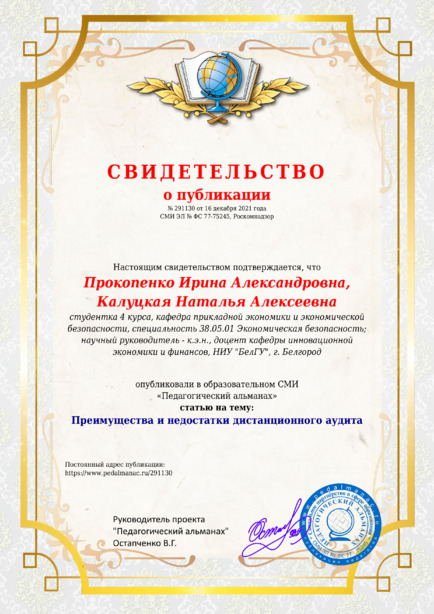Прокопенко Ирина Александровна, Калуцкая Наталья Алексеевна Преимущества и недостатки дистанционного аудита / И. А. Прокопенко. – Текст : электронный // Педагогический альманах : электронное СМИ. - URL: https://www.pedalmanac.ru/291130. - Дата публикации: 16 декабря 2021.