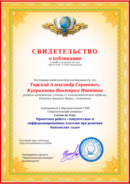 Тирский Александр Сергеевич, Куприянова Виктория Ивановна Проектная работа “Аннуитетные и дифференцированные платежи при решении банковских задач / А. С. Тирский. – Текст : электронный // Педагогический альманах : электронное СМИ. - URL: https://www.pedalmanac.ru/294684. - Дата публикации: 29 декабря 2021.