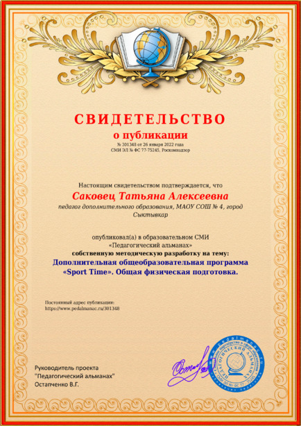 Саковец Татьяна Алексеевна Дополнительная общеобразовательная программа “Sport Time”. Общая физическая подготовка. / Т. А. Саковец. – Текст : электронный // Педагогический альманах : электронное СМИ. - URL: https://www.pedalmanac.ru/301348. - Дата публикации: 26 января 2022.