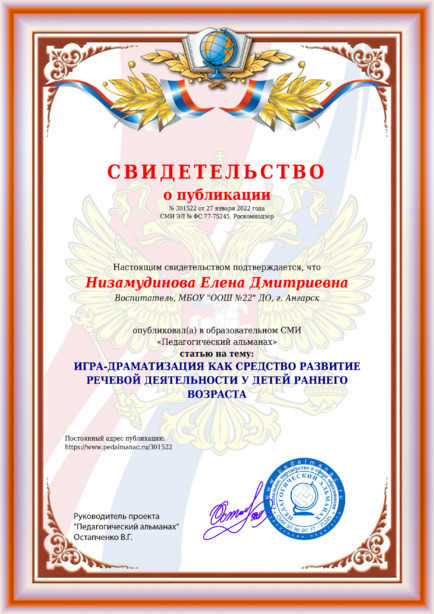 Низамудинова Елена Дмитриевна ИГРА-ДРАМАТИЗАЦИЯ КАК СРЕДСТВО РАЗВИТИЕ РЕЧЕВОЙ ДЕЯТЕЛЬНОСТИ У ДЕТЕЙ РАННЕГО ВОЗРАСТА / Е. Д. Низамудинова. – Текст : электронный // Педагогический альманах : электронное СМИ. - URL: https://www.pedalmanac.ru/301522. - Дата публикации: 27 января 2022.