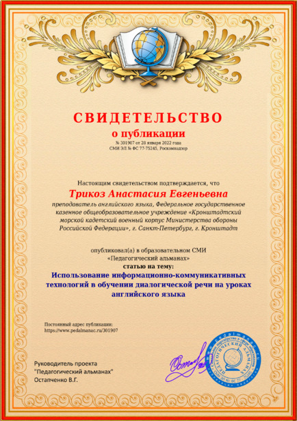 Трикоз Анастасия Евгеньевна Использование информационно-коммуникативных технологий в обучении диалогической речи на уроках английского языка / А. Е. Трикоз. – Текст : электронный // Педагогический альманах : электронное СМИ. - URL: https://www.pedalmanac.ru/301907. - Дата публикации: 28 января 2022.