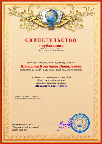 Шмырина Кристина Витальевна “Покормите птиц зимой” / К. В. Шмырина. – Текст : электронный // Педагогический альманах : электронное СМИ. - URL: https://www.pedalmanac.ru/302640. - Дата публикации: 1 февраля 2022.