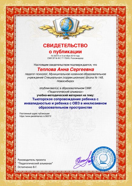 Теплова Анна Сергеевна Тьюторское сопровождение ребенка с инвалидностью и ребенка с ОВЗ в инклюзивном образовательном пространстве / А. С. Теплова. – Текст : электронный // Педагогический альманах : электронное СМИ. - URL: https://www.pedalmanac.ru/30272. - Дата публикации: 9 октября 2019.
