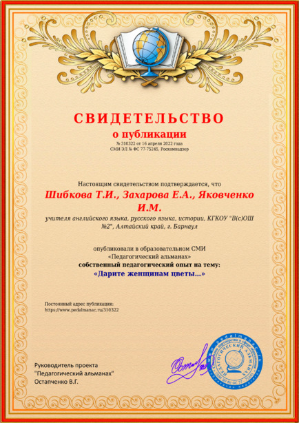 Шибкова Т.И., Захарова Е.А., Яковченко И.М. «Дарите женщинам цветы…» / Т. З. Шибкова. – Текст : электронный // Педагогический альманах : электронное СМИ. - URL: https://www.pedalmanac.ru/310322. - Дата публикации: 16 апреля 2022.