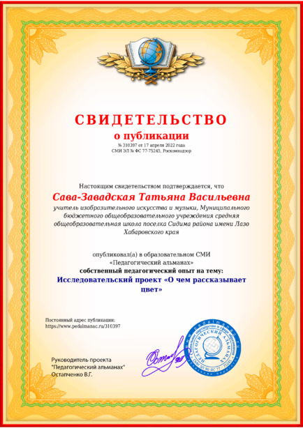 Сава-Завадская Татьяна Васильевна Исследовательский проект “О чем рассказывает цвет” / Т. В. Сава-Завадская. – Текст : электронный // Педагогический альманах : электронное СМИ. - URL: https://www.pedalmanac.ru/310397. - Дата публикации: 17 апреля 2022.