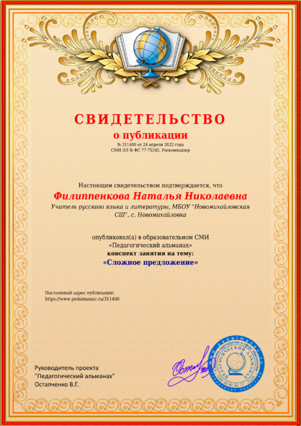 Филиппенкова Наталья Николаевна “Сложное предложение” / Н. Н. Филиппенкова. – Текст : электронный // Педагогический альманах : электронное СМИ. - URL: https://www.pedalmanac.ru/311400. - Дата публикации: 24 апреля 2022.