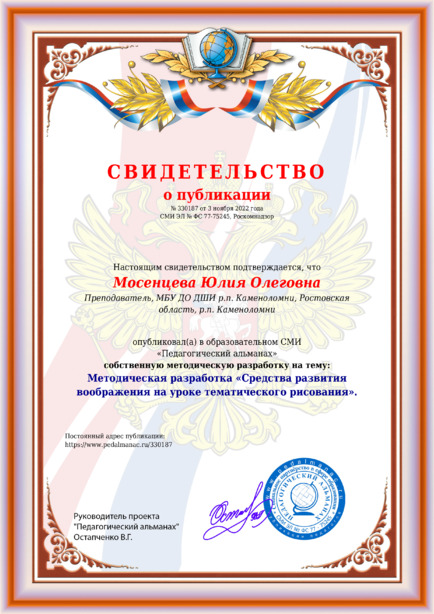 Мосенцева Юлия Олеговна Методическая разработка «Средства развития воображения на уроке тематического рисования». / Ю. О. Мосенцева. – Текст : электронный // Педагогический альманах : электронное СМИ. - URL: https://www.pedalmanac.ru/330187. - Дата публикации: 3 ноября 2022.