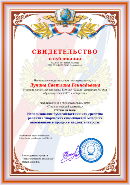 Лунина Светлана Геннадьевна Использование бумагопластики как средства развития творческих способностей младших школьников в процессе изодеятельности. / С. Г. Лунина. – Текст : электронный // Педагогический альманах : электронное СМИ. - URL: https://www.pedalmanac.ru/330418. - Дата публикации: 4 ноября 2022.