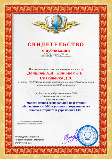 Данилюк А.И., Данилюк Л.Е., Пелюшенко Д.В. Модель допрофессиональной подготовки обучающихся с ОВЗ в условиях сотрудничества школы-интерната и учреждений СПО. / А. Д. Данилюк. – Текст : электронный // Педагогический альманах : электронное СМИ. - URL: https://www.pedalmanac.ru/330433. - Дата публикации: 4 ноября 2022.