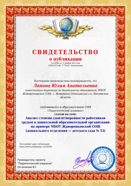 Лапина Юлия Анатольевна Анализ степени удовлетворенности работников трудом в дошкольной образовательной организации на примере МБОУ Жаворонковской СОШ (дошкольного отделения – детского сада № 53) / Ю. А. Лапина. – Текст : электронный // Педагогический альманах : электронное СМИ. - URL: https://www.pedalmanac.ru/332092. - Дата публикации: 11 ноября 2022.