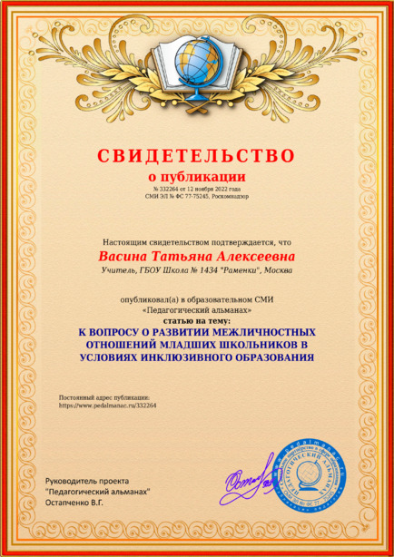 Васина, Т. А. К ВОПРОСУ О РАЗВИТИИ МЕЖЛИЧНОСТНЫХ ОТНОШЕНИЙ МЛАДШИХ ШКОЛЬНИКОВ В УСЛОВИЯХ ИНКЛЮЗИВНОГО ОБРАЗОВАНИЯ [Электронный ресурс] / Татьяна Алексеевна Васина // Педагогический альманах : [сайт]. - 2022. - 12 ноября. - [Россия]. - Режим доступа: https://www.pedalmanac.ru/332264, свободный. - Загл. с экрана.