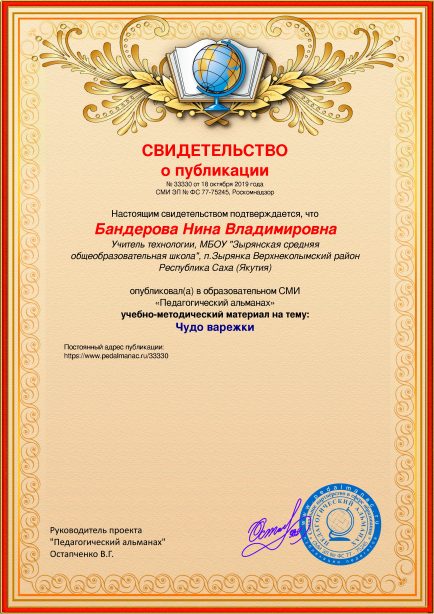 Бандерова Нина Владимировна Чудо варежки / Н. В. Бандерова. – Текст : электронный // Педагогический альманах : электронное СМИ. - URL: https://www.pedalmanac.ru/33330. - Дата публикации: 18 октября 2019.