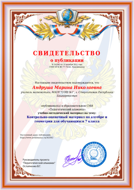 Андруша Марина Николаевна Контрольно-оценочный материал по алгебре и геометрии для обучающихся 7 класса / М. Н. Андруша. – Текст : электронный // Педагогический альманах : электронное СМИ. - URL: https://www.pedalmanac.ru/342043. - Дата публикации: 19 декабря 2022.