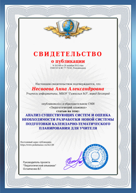 Несвоева, А. А. АНАЛИЗ СУЩЕСТВУЮЩИХ СИСТЕМ И ОЦЕНКА НЕОБХОДИМОСТИ РАЗРАБОТКИ НОВОЙ СИСТЕМЫ ПОДГОТОВКИ КАЛЕНДАРНО-ТЕМАТИЧЕСКОГО ПЛАНИРОВАНИЯ ДЛЯ УЧИТЕЛЯ [Электронный ресурс] / Анна Александровна Несвоева // Педагогический альманах : [сайт]. - 2022. - 20 декабря. - [Россия]. - Режим доступа: https://www.pedalmanac.ru/342189, свободный. - Загл. с экрана.
