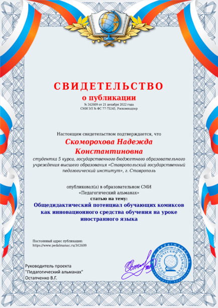 Скоморохова Надежда Константиновна Общедидактический потенциал обучающих комиксов как инновационного средства обучения на уроке иностранного языка / Н. К. Скоморохова. – Текст : электронный // Педагогический альманах : электронное СМИ. - URL: https://www.pedalmanac.ru/342609. - Дата публикации: 21 декабря 2022.