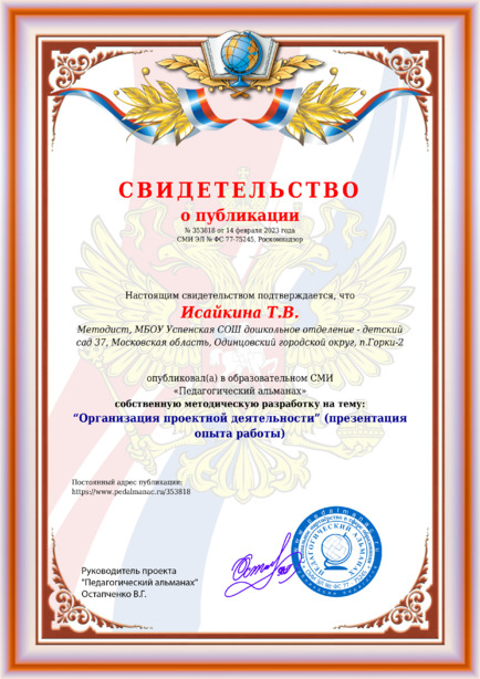 Исайкина, Т. “Организация проектной деятельности” (презентация опыта работы) [Электронный ресурс] / Т.В. Исайкина // Педагогический альманах : [сайт]. - 2023. - 14 февраля. - [Россия]. - Режим доступа: https://www.pedalmanac.ru/353818, свободный. - Загл. с экрана.
